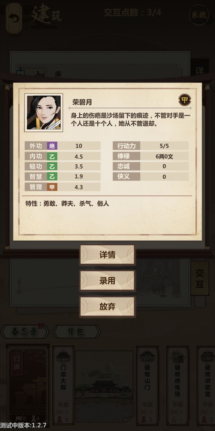 我觉得咱们这个游戏的战斗,到了后期随从的人数非常不合理,随着声望等级的上升,后期的战斗往往是我们这边两三个人打对面7,8个人。而且人家的随从多,还有击晕登特性,我们把门派建筑的科技搞出特性但是人数还是太少了,所谓双拳难敌四腿,希望官方能把门派里的那个讲武堂建设增多一个加随从人数上限的科技树。