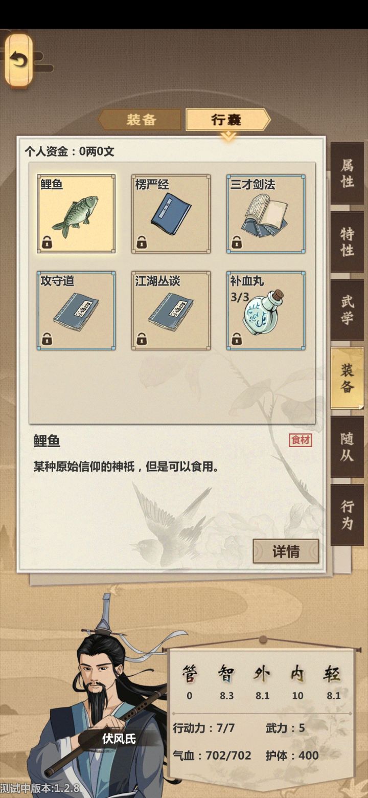 I'm这次我要来个2月打爆未知势力后续跟进出村属性感觉有点不舒服,明天继续来了闪避流已经初步达成,可以准备开搞大师兄就该去挖矿3月20日达成如此可惜一直没有遇到BOSS来了来了可惜不是剑法嗯?这是什么垃圾不行啊,我SL了5次,每次爆的都是这书,看来是固定的,那就没意思了4月21日掌门属性来了来了嗯?这就是闪避流的魅力纸鸾挺适合采药的目标达成,癫狂醉剑9月2日打