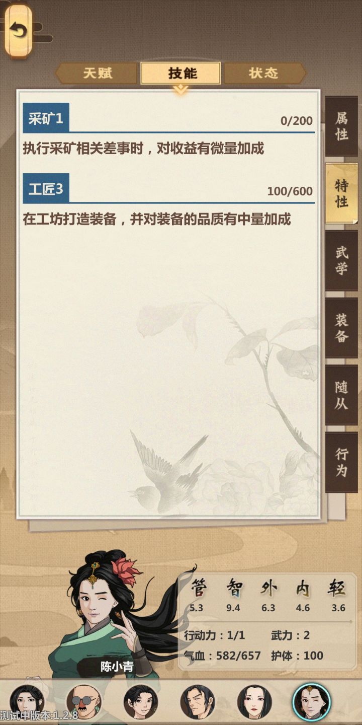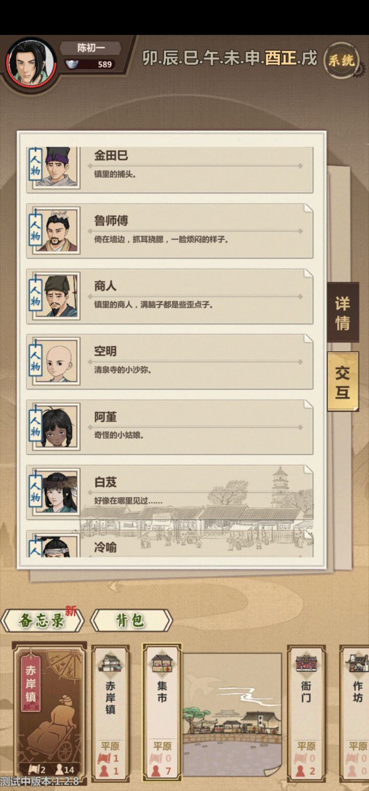 1金捕头:客栈选择报官2空明:午初对话吃饭3阿堇:饼摊给钱之后清泉寺拿天风心法4白芨:清泉寺画家任务换美人图,煎药一次再对话5冷喻:辰正医馆聆听,上香加魅力,末初要求屠夫跟随,打穿密林时选择已是屠夫娇妻。时间分配:开局工匠,剑客打三次,密林打穿,不做悬鱼,不帮窑工开路,自己买材料换美人图。当然要钱多可以去做任务的话少打剑客。测试就要结束了,还有其他隐藏人物吗?