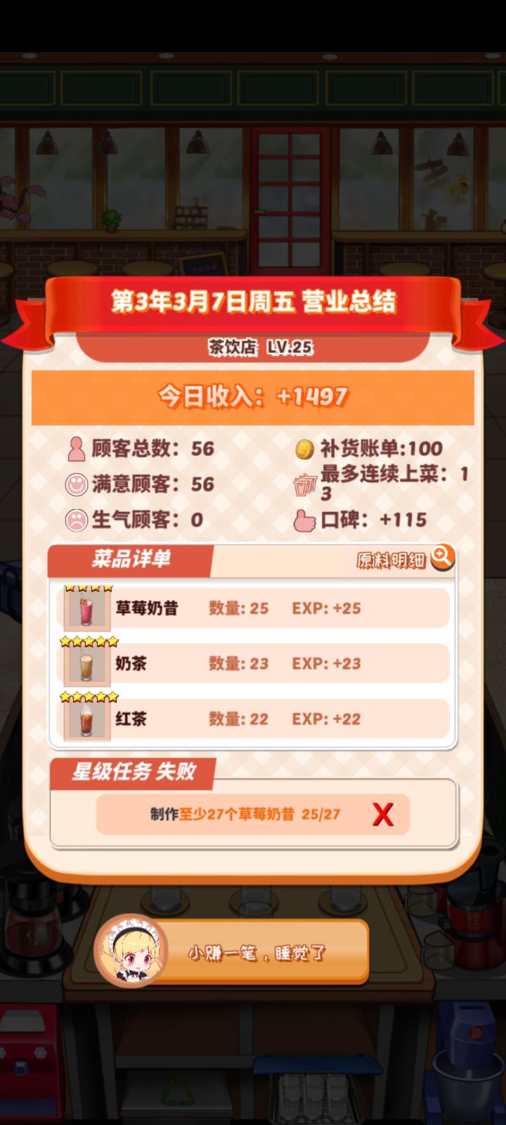 怎么说呢,玩到现在感觉都还可以,用来打发时间挺不错,唯一想要提的意见就是,能不能自己决定菜单上菜品的数量,别限制在五个,真的忙不过来。制冰机和打发器是硬性存在的,就导致明明只想做3个饮品,但是菜单上太多了,还不能下架,非常不方便。一些品质高的饮品,比如冰柠红茶和绿茶,杨枝甘露等等需要的材料很多,做起来也复杂,但是它们附带的饮品也多,还不能不做,游戏体验不好,对于这类复杂的饮品一般也不会选择。