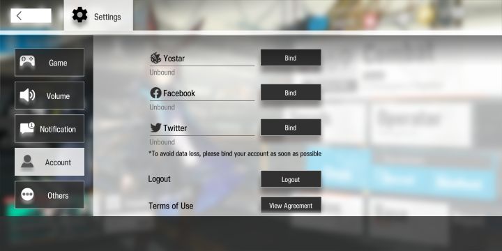 点开设置,然后进入“account”页面即可绑定账号,这个页面我目前只认得前三个分别是悠星、脸书和推特,下面一行小字是在提醒你尽快绑定账号。下面第一行是“注销”第二行是使用协议第三行是隐私政策没有脸书或推特账号的玩家点击悠星,使用自己邮箱即可,QQ邮箱即可(其他邮箱暂不确定)