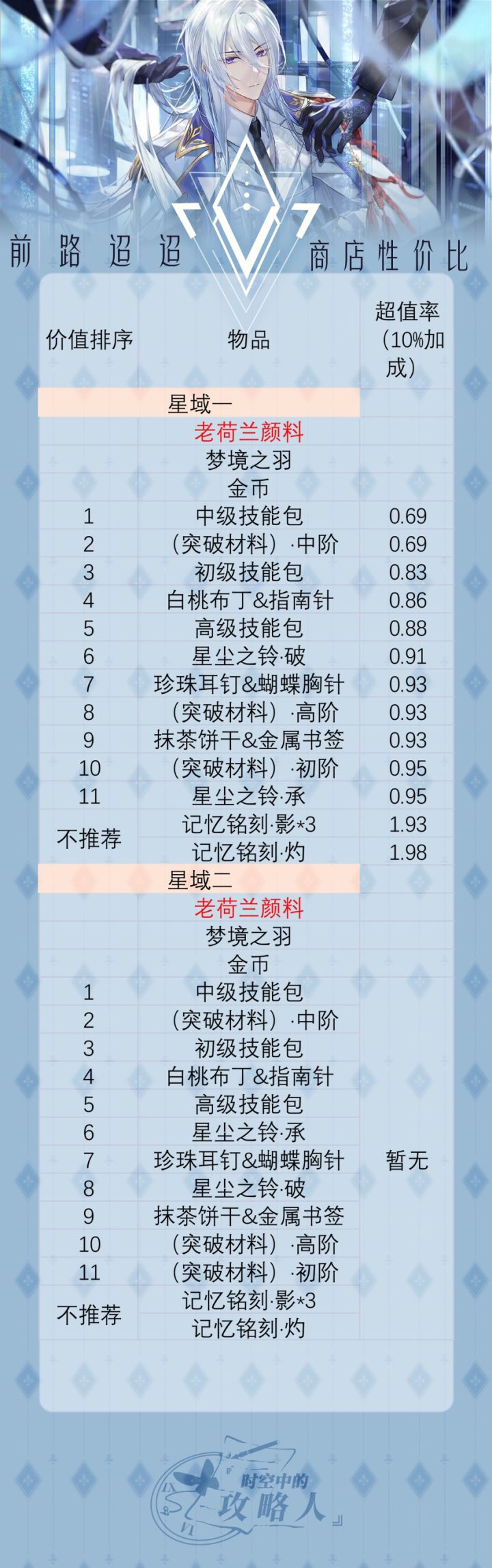 【前路迢迢·商店性价比】「莫忘来路,莫念归处」“我们的征途,是星辰大海!”——斗志满满踏上旅途,然后卡在了星门中转站(bushi)。好在有供给站,能给疲惫的旅者带来些许宽慰。已开放部分的商店性价比已完成,供小画家们参考~注:星域二25号开放,点击屏幕右侧“星域二”即可切换商店。