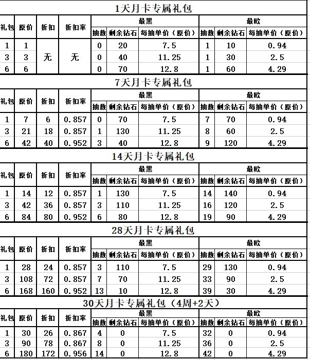【月卡专属礼包】抽数计算,分1天、7天、14天、28天、30天。不买贵的,只要欧一次也能6块1抽。专属礼包开过月卡之后才能购买。可以按天数和周数购买,按周有折扣。多推人或者当期池子有需要的可以考虑。心态放平,做好非酋的准备。