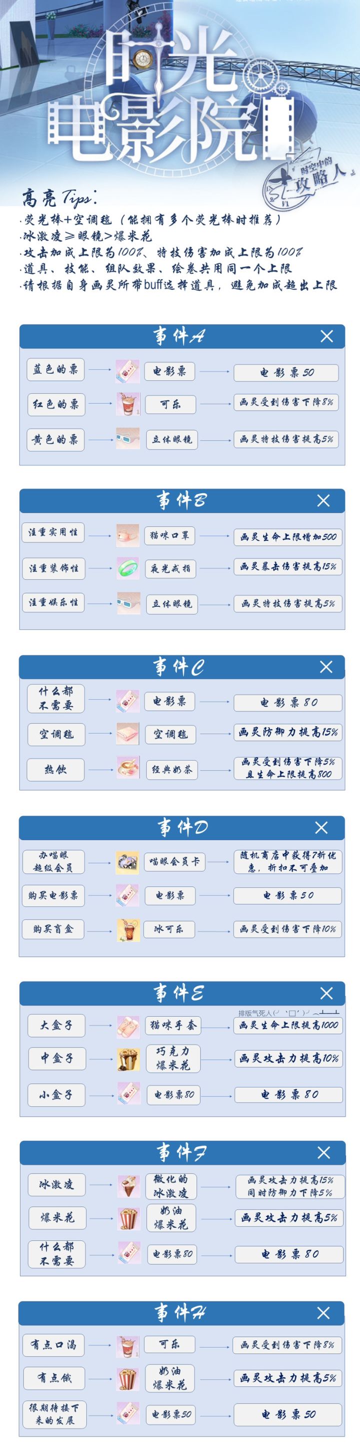 【时光电影院·道具攻略】“所有人生的谜语都可以从电影中找到答案。”小画家们都集齐全员的头像框了嘛?(单推人已然老泪纵横…道具的辅助起到了必不可少的作用,在此整理了{道具效果汇总表+事件掉落道具攻略},希望能对各位的爬塔提供帮助~