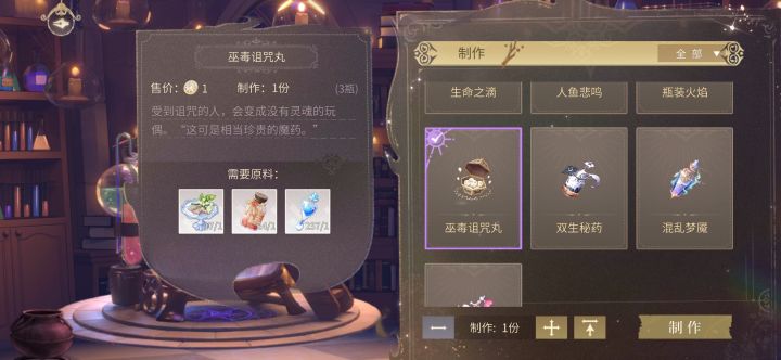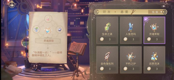 灵魂萃取(3元)=接骨木+罂~粟~液+月长石金色强化剂(3元)=蝙蝠牙+罂~粟~液+月长石不朽之护(3元)=蝙蝠牙+草蛉虫+月长石还原泡沫(3元)=罂~粟~液+草蛉虫+月长石猫鼬灵药(3元)=草蛉虫+草蛉虫+月长石续古灵(1元)=接骨木+接骨木+月长石虹光灵球(1元)=接骨木+草蛉虫+月长石精灵之梦(1元)=蝙蝠牙+蝾螈皮+月长石永恒之雪(1元)=罂粟液+罂~粟~液+月长石黑夜永