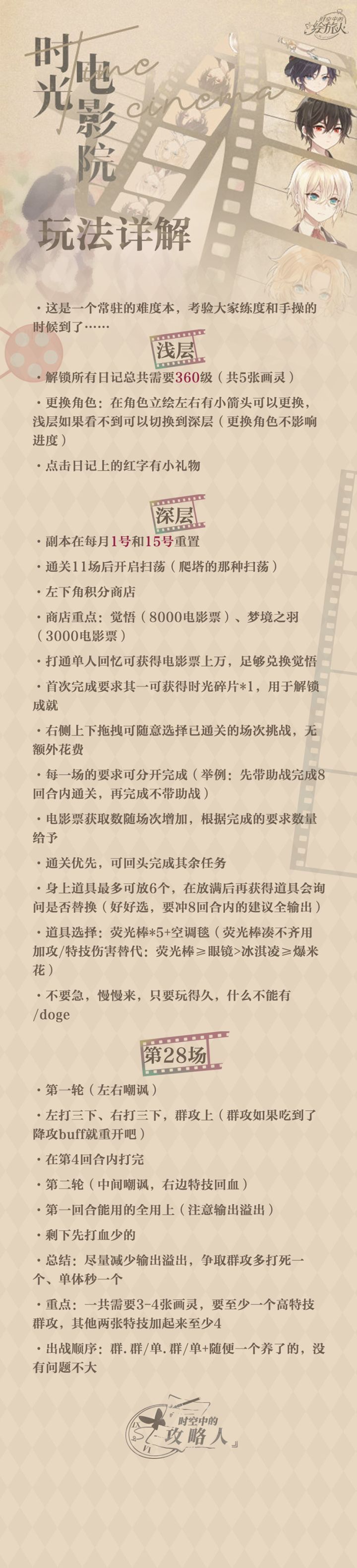 时光荏苒,开服已久,养卡如何,影院曝光——这次的时光电影院活动有小画家打通打完了吗?(下次还敢填简单攻略大大在群里集(哀)思(嚎)广(已)益(久)终于写出了这一份建议~大家可以看看参考参考?或者需要把大佬的28过关视频放出吗?ps:攻略人建议大家可以等助战优化之后再挑战!