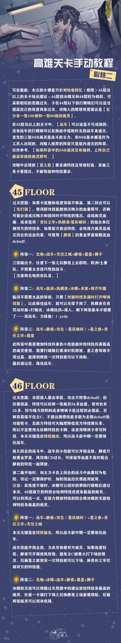 中午好打碟姬们久等啦!《高难关卡手动操作(必修二)》下册终终终于来了! 下册的主要内容是大家呼声很高的爬塔45-50层的过关思路及参考阵容。划重点,是参考阵容哦,并不是最优解~ 打碟姬们如果有其他的过关思路,也欢迎向攻略人投稿PS:不要忘记午饭和公众号签到~