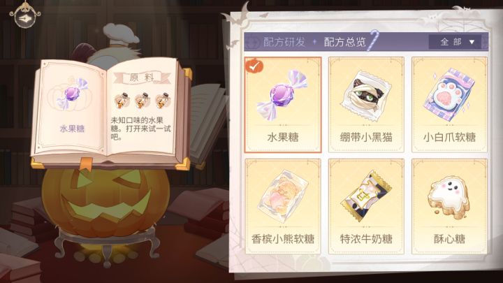 水果糖:三个水果粒,绷带小黑猫:三个可可粉,小白爪软糖:三个幽灵吉利丁片,香槟小熊软糖:三个巫师药剂,特浓牛奶糖:三个一小杯牛奶,酥心糖:三个一小盒黄油,莓果巧克力:一个幽灵吉利丁片,一个水果粒,一个可可粉,芒果椰奶冻:一个水果粒,一个一小杯牛奶,一个幽灵(都知道名字了,接下来直接简写)小煤球:一个巫师药剂,两个可可粉,香草松露球:一个药剂,一个可可粉,一个黄油,鲜奶冻:两个幽灵,一个牛奶,雪花酥