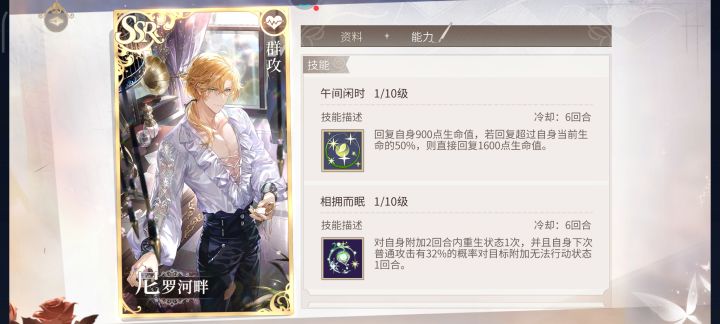 技能很怪。生存能力强,群攻里面离谱的生存拉满,特技需要配合别的卡帮他闪避,如果运气好,自奶、重生、冰冻、2连闪避无缝,打一套下来自己根本不怎么受伤。定位是情感的话以快速大招回转为主要攻击手段。因为防御点满,所以需要别的卡辅助加伤。低特不行,高特可以一看,但常规就业空间不大,可能某些高难本能用。