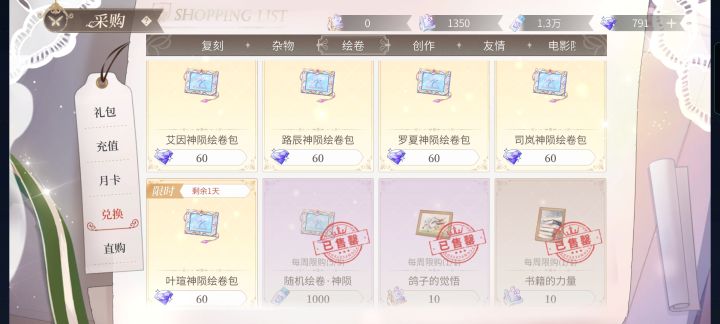 姐妹们神陨绘卷是可以免费换的,最好不要花钻石抽。P1是绘塔(绘卷回忆),50层以后可得记忆重刻卷。记忆重刻卷可以换绘卷。神陨绘卷在采购-兑换-绘卷-随机绘卷神陨( P2),每可以换五个,而且是一直存在的。如果不是现在特别想要一张绘卷不用拿钻石抽的,之后慢慢换就行了。