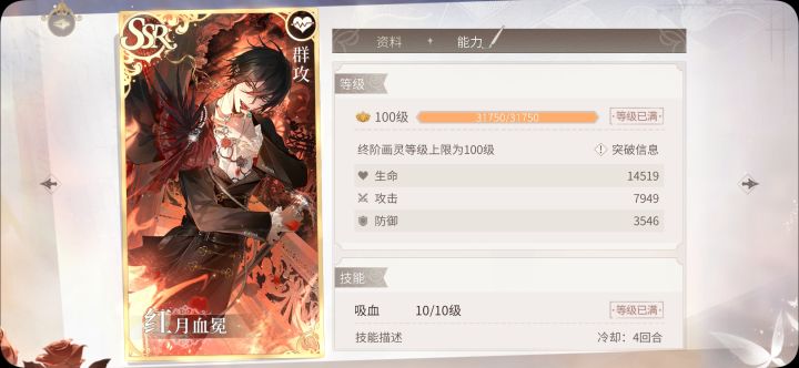 1.先看攻击白值,7949比大翅膀还高将近300,搭配满级绘卷可达接近9500的攻击力,属于优秀水平。2.吸血小技能增伤很强。大翅膀的小技能是特技伤害提高37.5%,而吸血虽然我还没实测,但攻击38%加上特技25%,相信不比大翅膀的低。吸血虽然扣队友1500的血,但生命高于50%的时候可以用另外一个小技能嘲讽,到后期的副本,帮队友挡的这几下攻击肯定比1500高吧!新人低级体验可能没那么好,因