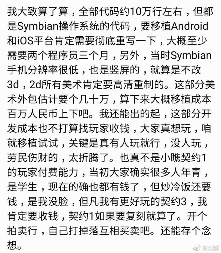 家里没有电脑,用手机搜索东西太费劲,上班我就又搜索了一下关于契约的新消息,很失望,一点有关于契约的最新消息都没有,可能还需要等待,真不知道吴刚怎么想的,是不是真的打算把契约这部经典的大作永久封存,还是想出新的作品,让过去的就过去吧,一切往钱看往钱走,感觉这么好的经典永久的活在记忆里真的太可惜了,不做就请出手卖出版权,卖出去让给想开发的人,让契约重见光明,活在当下祝福:契约的老玩家们,牛年大吉,健