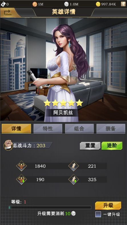 一:英雄养成——界面:在英雄养成主界面,玩家可以一览英雄的基础属性,查看各个属性详情,进行英雄进阶,分解或者重置等操作。二:英雄养成——升级:消耗材料,提高英雄等级,全面提升英雄属性。三:英雄养成——进阶:消耗对应相同的英雄卡,可以使同一英雄进阶,提升英雄特性的等级,从而提升特性的效果。四:英雄养成——装备:每名英雄能够装备6个特殊道具,为英雄角色提供一定的属性加成。