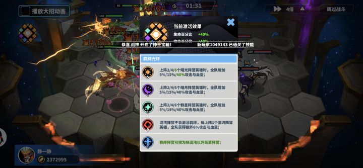 游戏最多可以上阵8个英雄,然后因为同阵营上阵6个有最大的加成40%攻击血量,所以我们就要围绕这个来搭配,因为稀有角色的属性会比普通橙色强很多,所以我们可以选择3个阵营的稀有角色+一个阵营5个普通橙色来搭配出6阵营的最大加成 三个阵营中推荐使用6曙光(这边的辅助英雄很多,控制,回血)