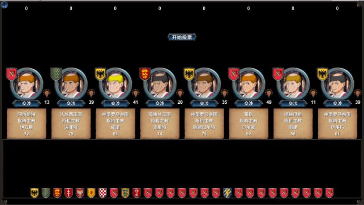 教宗选举每当教宗去世之时,天主教的独立国家可参与教宗选举,可以选择一名自己钟意(利益更大)的枢机主教,被支持的枢机获选后可给予教宗协助点。票选前从枢机中选出最具潜力的8名。票选时共30票,需>20票才能获选,如三轮无法选出将挑选三次总票最多者。被开除教籍者也可参与,如果选中的枢机获胜,可以恢复教籍。天主教国家的各位领主们会优先支持自己国家的枢机主教,因为可以获取更大的利益。由于历史的选举过程