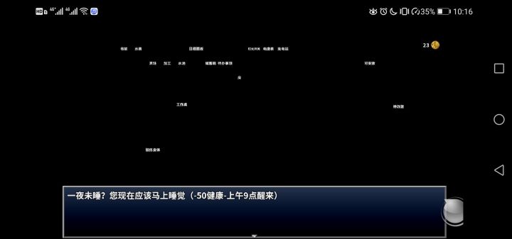 这玩意是bug吧,明明11点上去睡觉了,说一夜未睡,扣50健康,按照这个说法。间断的两个夜晚未睡就会死亡。第二个,继续睡觉,说9点起,实际上是到第二天6点,你觉得正常?第一天晚上没睡好,结果补觉睡了一天一夜。只要触发这个事件,一下扣70健康