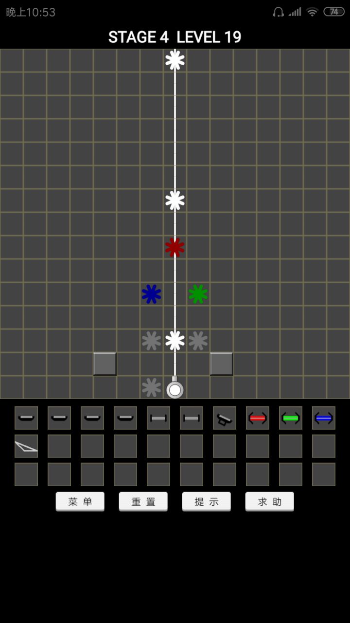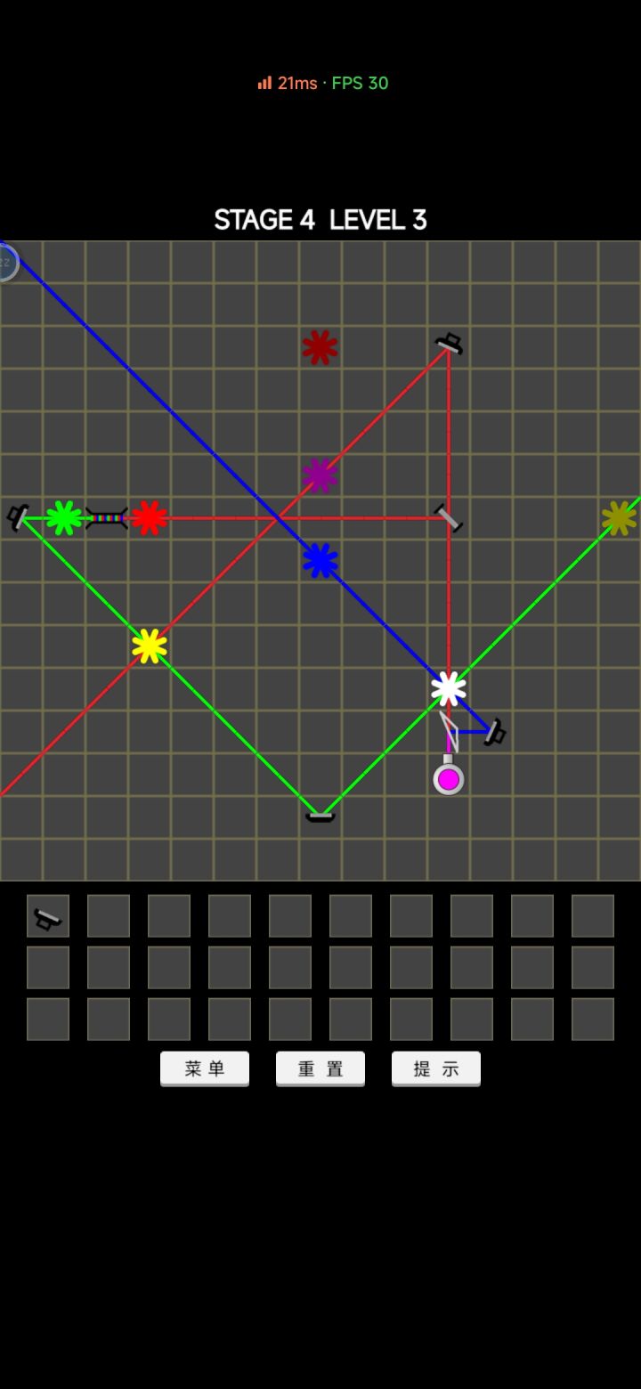 4-19的正常过法从给的镜子和关卡分析,本关是通过分光镜分出3条白光分别通过红绿蓝三花并在光路上放置三色透镜在通过镜子的反射聚合到一点(光的排列应该是蓝绿红)在聚合点放置三棱镜就可以通关了之后是邪道过法可以省下两面镜子 等待作者修复