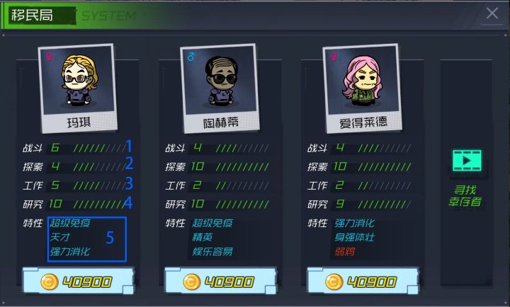 1、战斗:攻击力,随着等级上升,差距会拉很大。重要度:++++2、探索:行走速度。探索10的速度比探索5的走的快。重要度:++++++3、工作:工作产量,低的话会不愿意工作。重要度:++++4、研究:科技产量。比如是研究10的话就会产量翻倍。重要度:+5、特性很重要,最好是两蓝以上以上数据感谢@五宗罪1、懒:爱不爱回房睡觉 这条是蓝属性好2、殃:爱不爱生病去医院 这条是红属性好,反