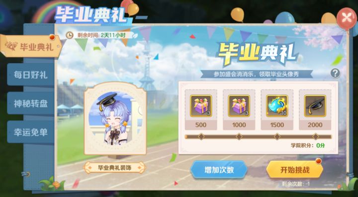 各位天行者大人们好!转眼间又迎来了一届毕业季夏至未至之时我们即将开启新的征程此刻米娜想邀请您参加云上毕业典礼踏上新征程前请再一次奏响那共同的青春记忆吧此外米娜在文末还安排了礼包码喔~一、毕业典礼1.通过消除演唱道具可获得分数2.消除指定演唱道具可获得双倍分数3.游戏时间结束,根据达到的分数可获得对应数量的学院积分和学院礼盒奖励4.演唱会热度对应奖励:0~400:学院积分*1