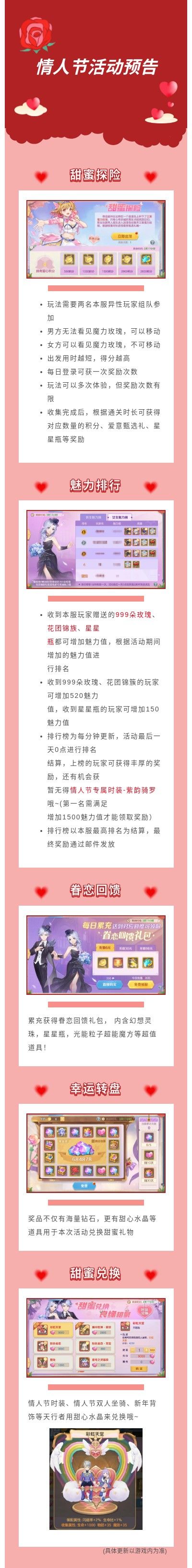 春风十里,不如在云上城遇见你~万众期待的甜蜜情人节即将火热来袭!米娜携高甜情人节活动,陪天行者度过甜蜜情人节啦~~快来一起看看吧!游戏内明天(2月11日)将开启活动【甜蜜眷侣】,届时会有【甜蜜探险】【魅力排行】【眷恋回馈】【幸运转盘】【甜蜜兑换】等主题活动,具体活动内容以游戏内为准哦~