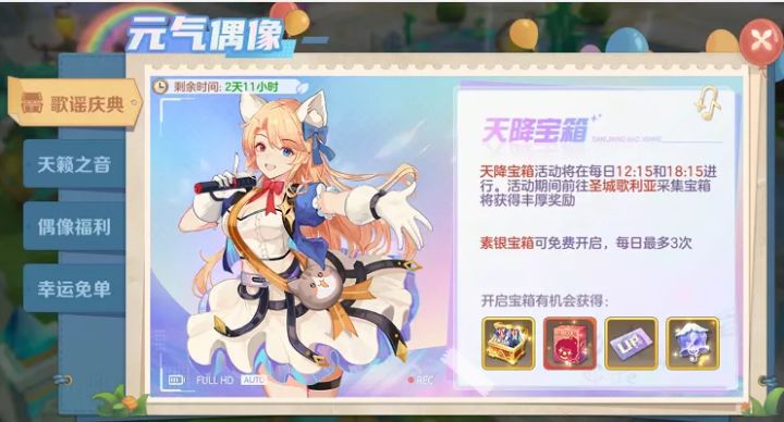 云上城偶像季正式开启啦!说起偶像米娜脑海中就浮现蓬蓬的小裙子,亮晶晶的饰品还有灿烂的笑容!偶像季云上城将迎来什么新变化呢?请随米娜看下去吧~ ———— 歌谣庆典 ———— ———— 天降宝箱 ————天降宝箱活动将在每日12:15和18:15进行。活动期间前往圣城歌利亚采集宝箱将获得丰厚奖励。素银宝箱可免费开启,每日最多3次开启宝箱有机会获得偶像服装哦~———— 服装预览 ———— —