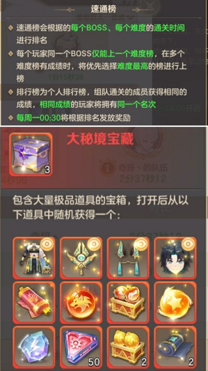 大家好,我是玛吉纳,今天呢给大家带来大副本竞速的小秘密。大副本秘境玩法自从上线后,很多小伙伴都奔着大副本的奖励去了,除了每周例行的通关奖励外,更多的是争夺我们每周大秘境的排行榜奖励。排行榜也就是速通榜,速通榜会根据每个BOSS、每个难度的通关时间来进行排名。每个玩家同一个BOSS仅能上一个难度榜,在多个难度榜有成绩时,将优先选择难度高的榜进行排名。这边就有一个需要注意的了,当你有更高难度的