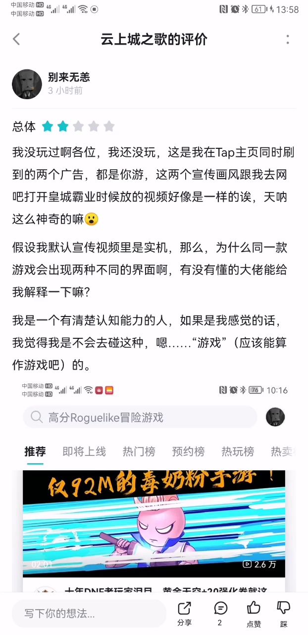 我就截图对比了一下游戏的两张宣传图,就有耿直boy上来怼我,我还不敢骂他,怕关我小黑屋。大家快来看戏啊,顺便帮我看看这个哥们究竟是何许人也😕