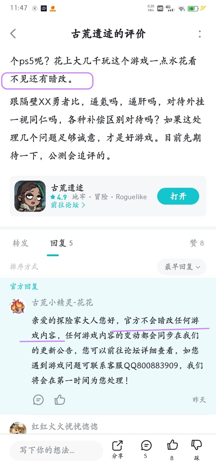 这是你自己说的从不暗改是吧?来你自己看看还不承认暗改,以前只有紫书灵下雨才4s,橙色和暗金都是6s,现在暗金和橙色都是4s了提都不提,还不暗改?还不暗改,摸着良心想想不暗改了么?竞技场伤害机制上周没改过?经常打竞技场的玩家会不知道你暗改?还有大剑公告只说削弱蓄力时间,你反手把大家仅剩四秒的顶级霸体都暗改没了,随便被破霸体,这你公告有些?全是暗改还不承认了是吧?你游是真行啊😅😅