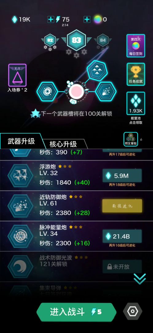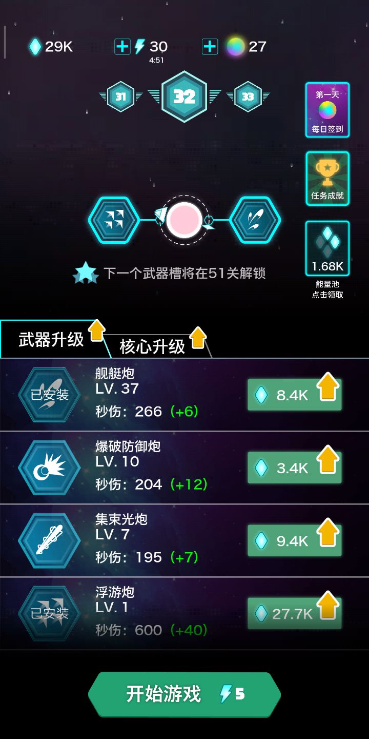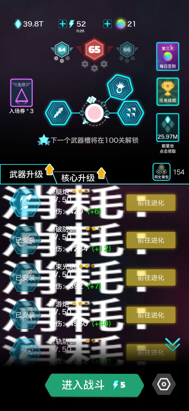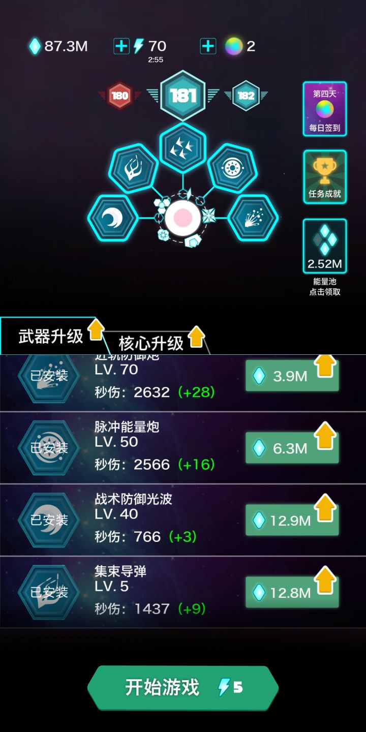 先说浮游,有时候出来4个小飞机,有时候出来一个。有时候半年不出来,有时候出来马上就消失了。起名叫浮游,是不是对浮游有什么误解??你以为你是红警里的航空母舰呢???再说刚出的近轨,看名字我就有不好的预感,果然。有啥用?近身跟怪玩游戏吗??好了。到头来还是老三件。。然后性价比极低的武器升级。投入产出不成正比。建议大家只升级能量池,当做放置游戏玩!!!