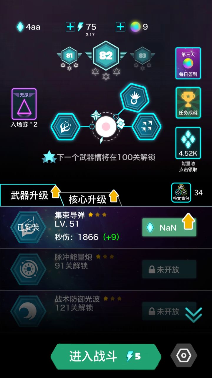 bug1:NANbug2:打了半天就给1个钻??而且我还是看完广告复活打下来的。。(好像是1.几aa,然后aa没显示出来???bug3:怪越多越卡,特别是开大之后bug4:领取无尽入场券并不能到账