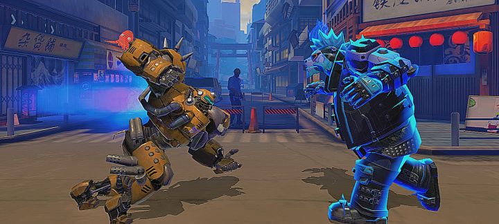 夜晚,无数盏霓虹灯照亮了地面,巨大的全息投影笼罩在东方町上空,这一切华丽的光景都仿佛蓄意粉饰着这虚假的繁荣。一家酒吧里,一个身披黄色机甲的高大男人坐在吧台前,他没点任何饮料,只是静静的坐着,仿佛在等待着什么人。在他四周可以看到来自世界各地的机甲使用者,金属对决开赛在即,很多参赛者都会选择提前来这边生活。比较引人注目的是远处一个戴橙色帽子的机甲,他似乎只有一个人,但玩跳舞机玩得不亦乐乎。面前的酒