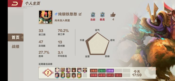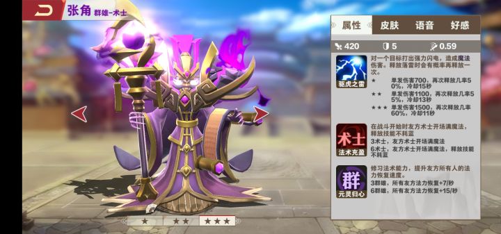 首先群雄术士张角 这模样霸气侧漏啊,比吕布霸气多了。4费,技能看脸,欧皇最爱,2星1100伤害着实不低。魏国刺客张郃,4费,被动技能是降蓝,如果暴击将眩晕敌人,3星才280的攻击,攻击力不高,明显的外挂刺客,没有攻击加成不能作为主力。仙士主公水镜,5费,你没看错5费!凑4仙士的路遥遥无期啊,技能百分比掉血,注定不能作为一波流主力,只能是锦上添花。主公技就牛了,加一人口,后期真的可能,人人都在抢