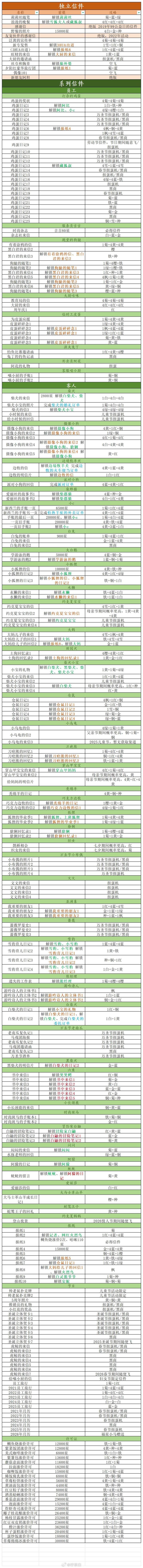 原作者是微博:柠茶白‼️此条是转载❗️更新至【2026-3-8】➖➖➖➖➖➖➖➖➖➖➖➖➖➖➖⬇️ 【当前进度:独立信件14+系列信件234】1.新增【黑白君的来信6】前提条件(存疑):解锁黑白君的来信5获取方式:黄+绿+铜2.新增【狗腿的随笔4】前提条件(存疑):解锁狗腿的随笔3获取方式:樱+蓝+种3.新增【给喵小厨的信】获取方式:2026妇女节期间(3月8日