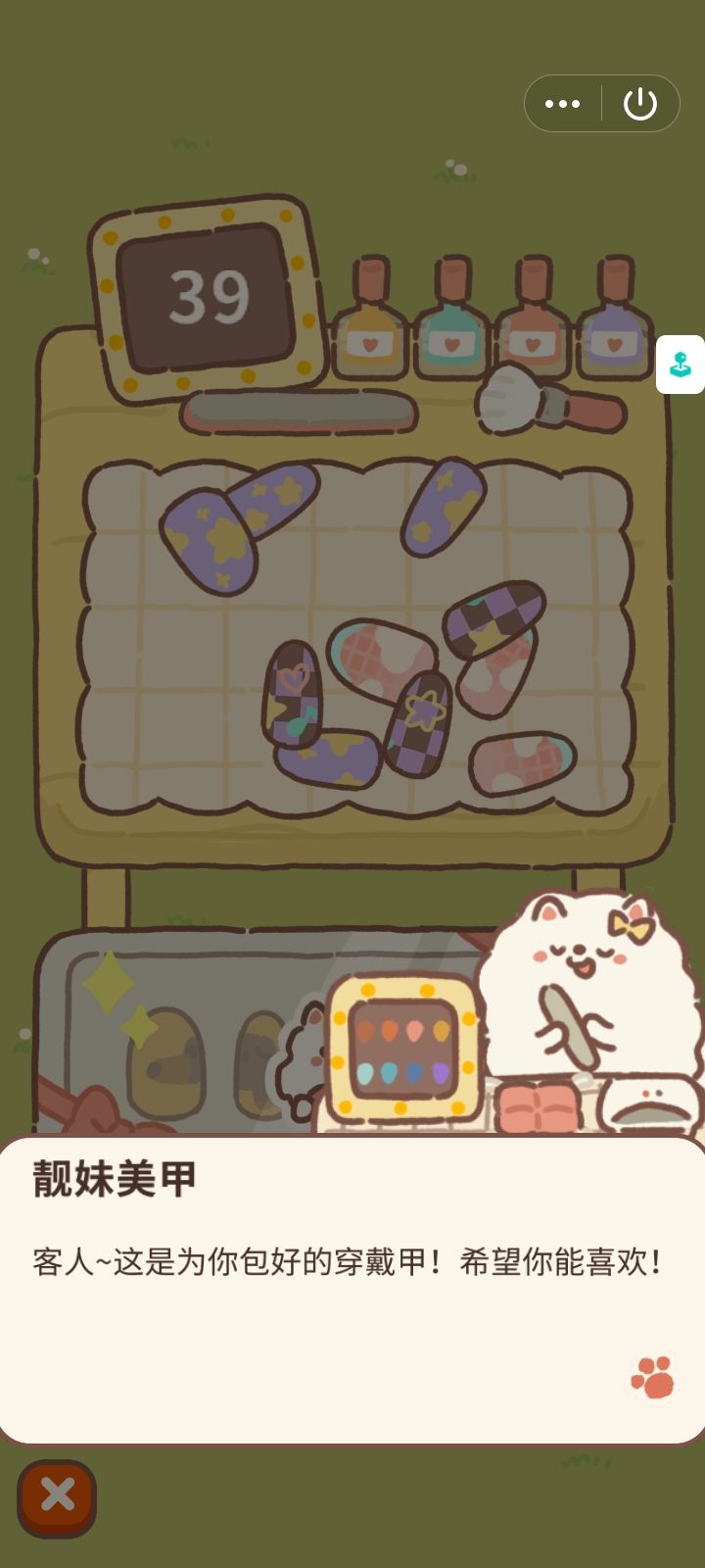 第一步:把美甲分好类,有五个指甲的是此次游戏所需要的一套美甲第二步:按照指甲的大小与下方的盒子中的阴影匹配(美甲上的花纹要形成一个连贯的图案哦)第三步:如果顺序错误将错误放置的两个美甲拖拽进行调换