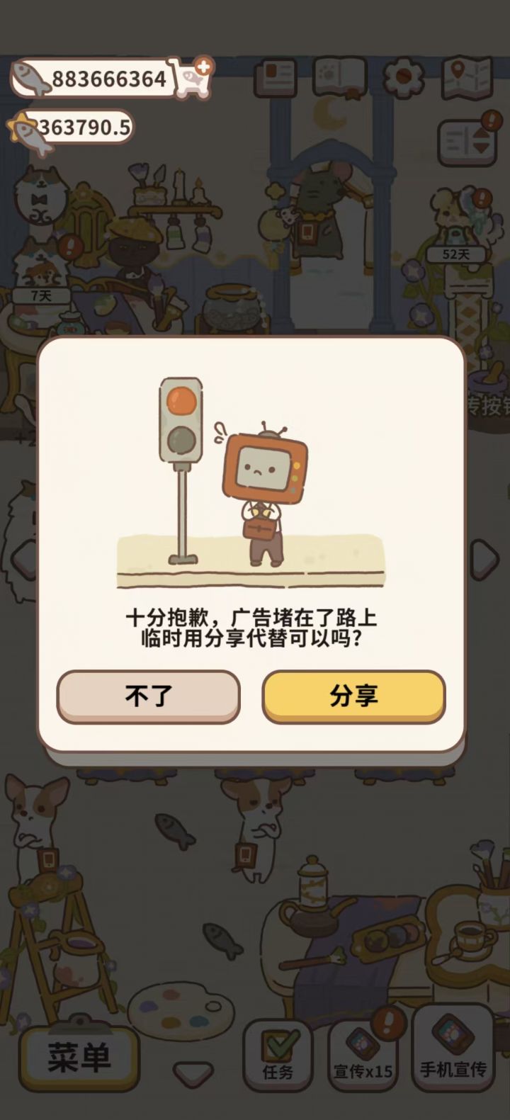 看不了广告,现在只能用分享来代替。现在做万圣节广告任务。根本不好完成,光是等待刷新分享就要等待十几多分钟