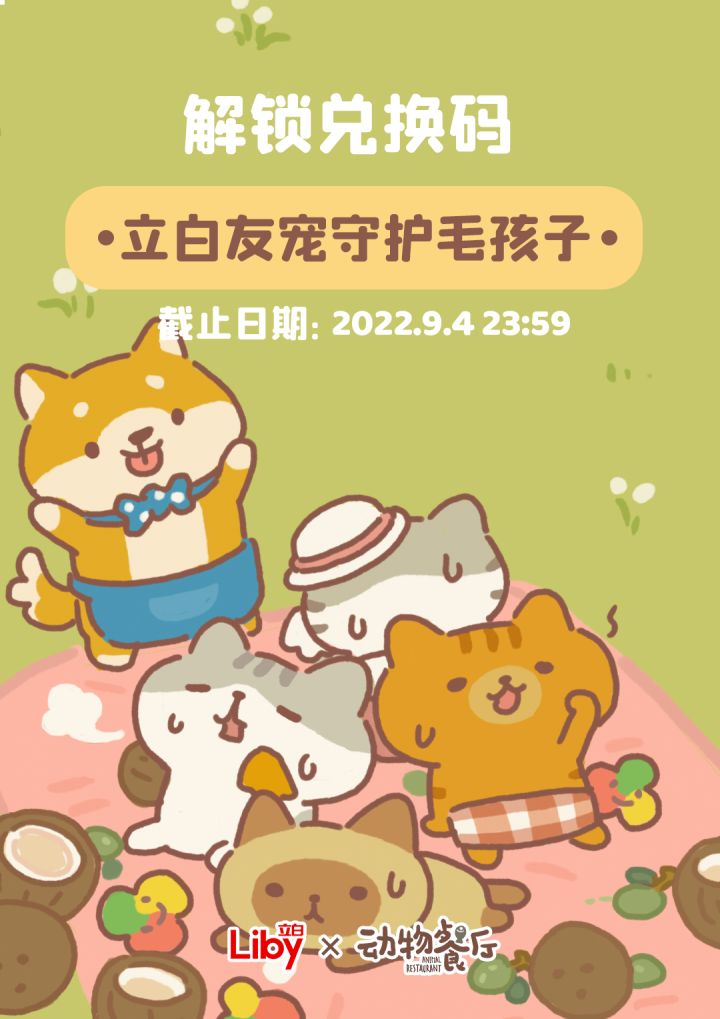 老板们,没想到这么快就达成了目标成功解锁兑换码,你们真的太棒啦!在兑换纪念物的同时,也可以号召身边的朋友继续参与视频拍摄哦~每次成功投稿,都将为流浪动物基地捐出50g爱心宠粮[爱你]【兑换码】立白友宠守护毛孩子【截止日期】2022.9.3 23:59[星星]兑换方法:①小程序玩家点击“设置”,再点击“兑换码”,输入兑换码即可获得。②app玩家点击“设置”后,再点击左下角小猫,输入兑换码即可获得。