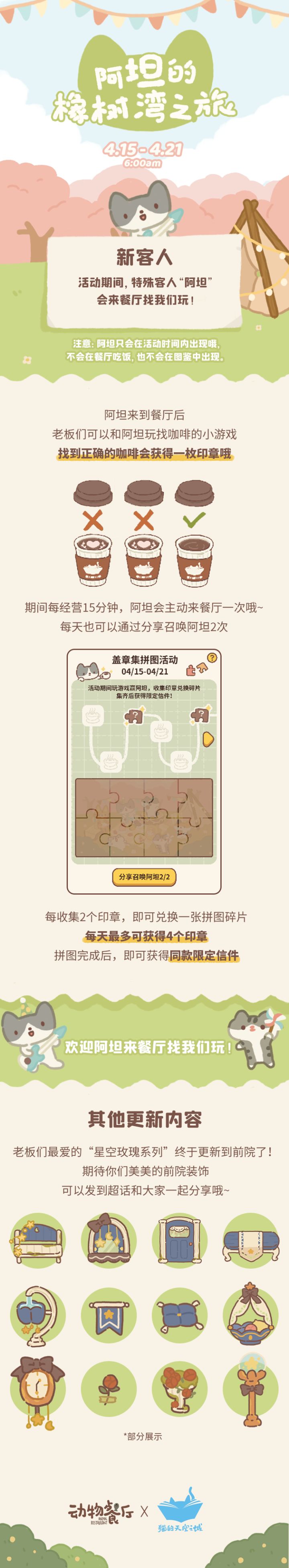动物餐厅又来新朋友啦,它就是来自天空之城的阿坦。阿坦是一个邮递员,很喜欢旅行和喝咖啡,是一位很靠谱很温暖的大男孩哦~老板们热烈欢迎!拿出大家的热情!