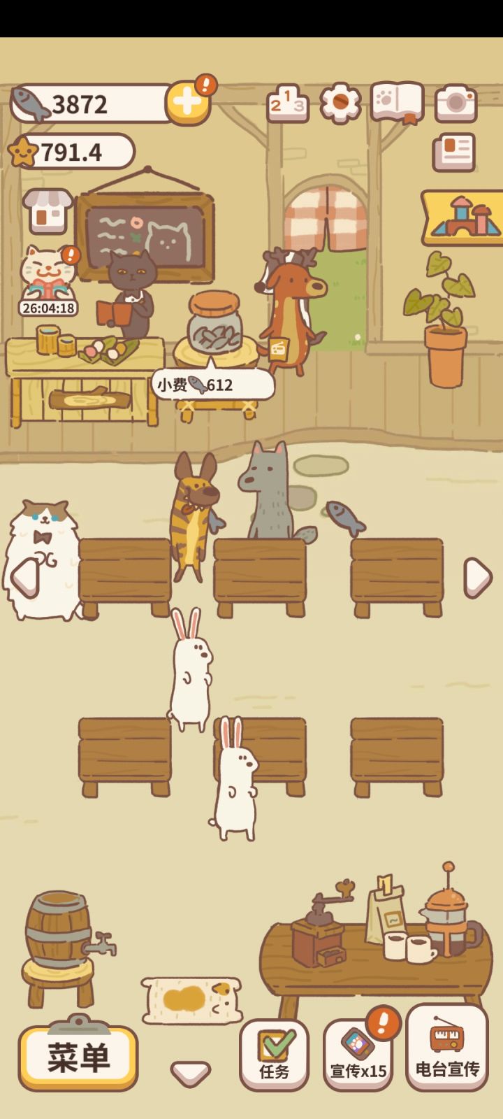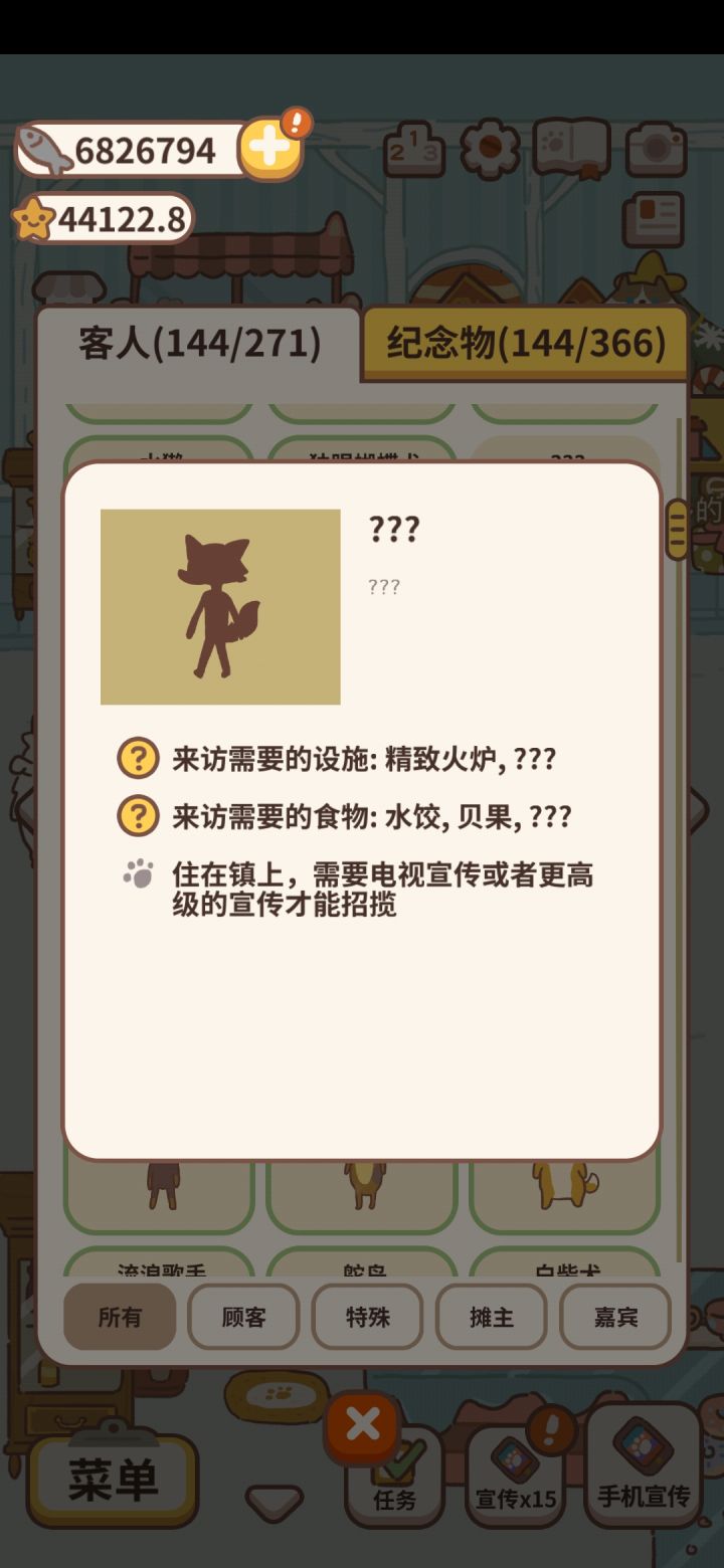 在动物餐厅游戏里,小狐狸的来访文艺小桌上的花瓶中需要有向日葵、玫瑰、蓝风铃这三种花,然后将这三种花不同级别摆放就有概率将其小狐狸招揽过来,招揽前还需要星星评价达到2800星才能够解锁小狐狸。其次想要升级评价星星可以通过完成每日任务,完成所有任务以后会获得25个星星,观看视频之后还能翻倍。也可以通过完成神秘的预定,完成之后奖励是非常丰厚的,完成一次奖励20颗星星。 还可以通过接受订单来完成任务,你