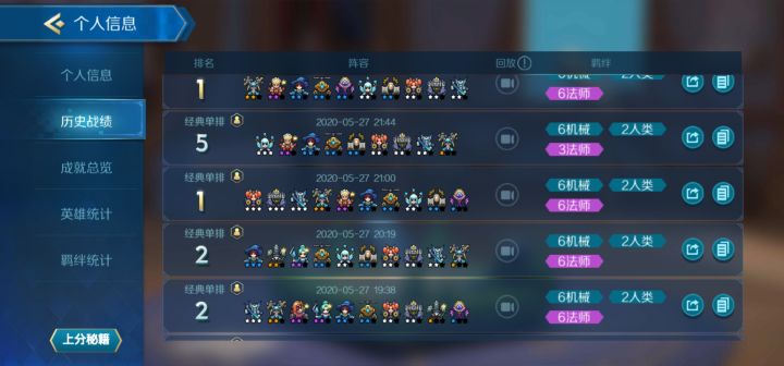 今天终于更新了,不用一直玩人法和哥布林了。正巧今天也上了宗师,分数也就不重要了,于是就迫不及待的开启了机械法的尝试。我的想法是:今天削弱了亡灵,加强了机械,必定导致亡灵用的人少了许多,2亡灵会有,4亡灵估计会少很多,此消彼长,正是机械崛起之时。一共打了5把,4经典1极速,上战绩:一开始的设想,是极致暴力,所以带了光法,结果两次都被海妖+鲨鱼制裁了,于是改变思路,换了和尚。第五名那的那次,特