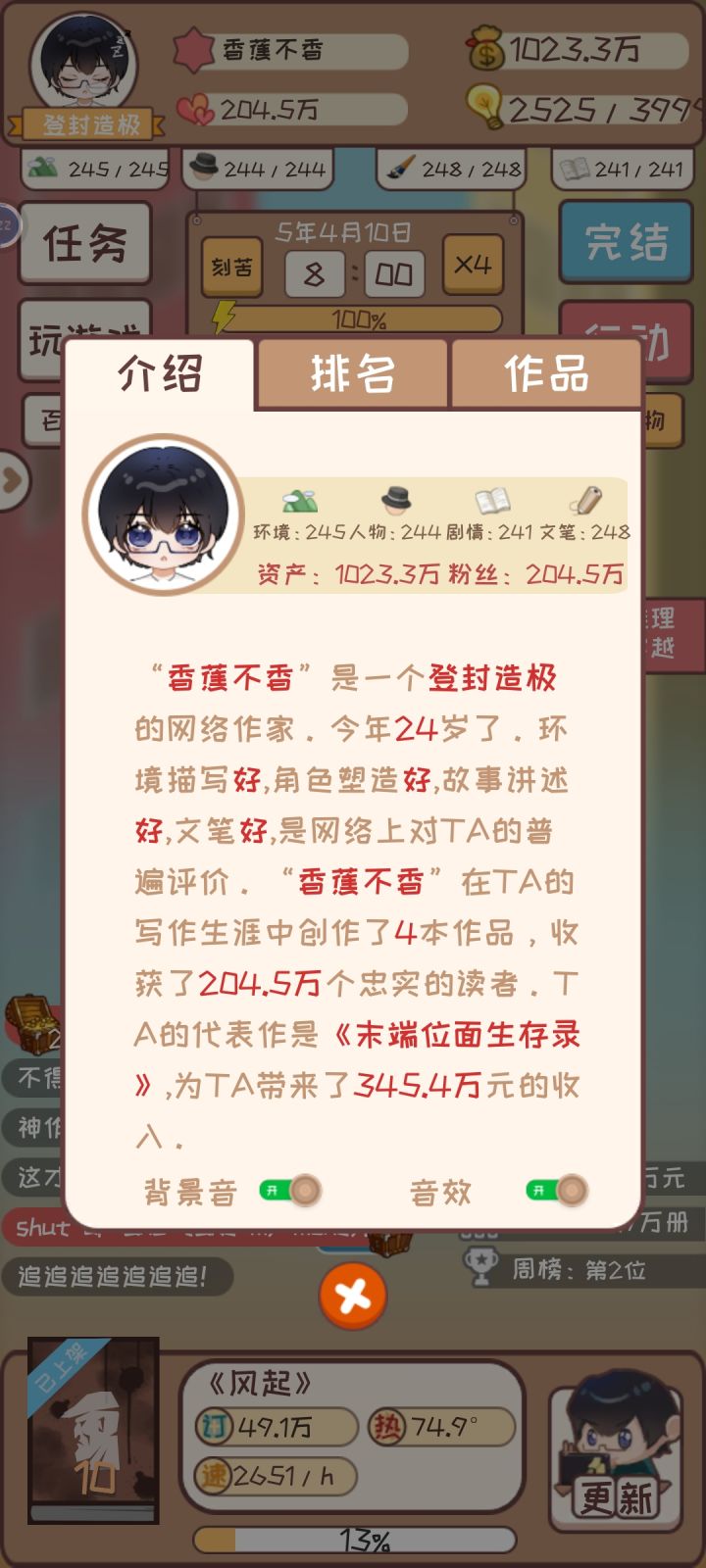 这个游戏上手难度非常大,看起来很简单,实则深藏不露,难倒不少的玩家。下面进入正题。开局的属性很重要,建议把4维弄高一点,再开始游戏。前期写作难度非常大,一定要选一个正确的网站,看清自己的实力。右边蓝色的是体力值。体力值在30%以下的时候,写作速度会非常慢,建议不要玩命写作,可以在行动中获得灵感。一定要及时存档,不然的话白玩儿还有不懂的可以在下面留言。我会及时解答。最后多大家端午节安康(快乐)!