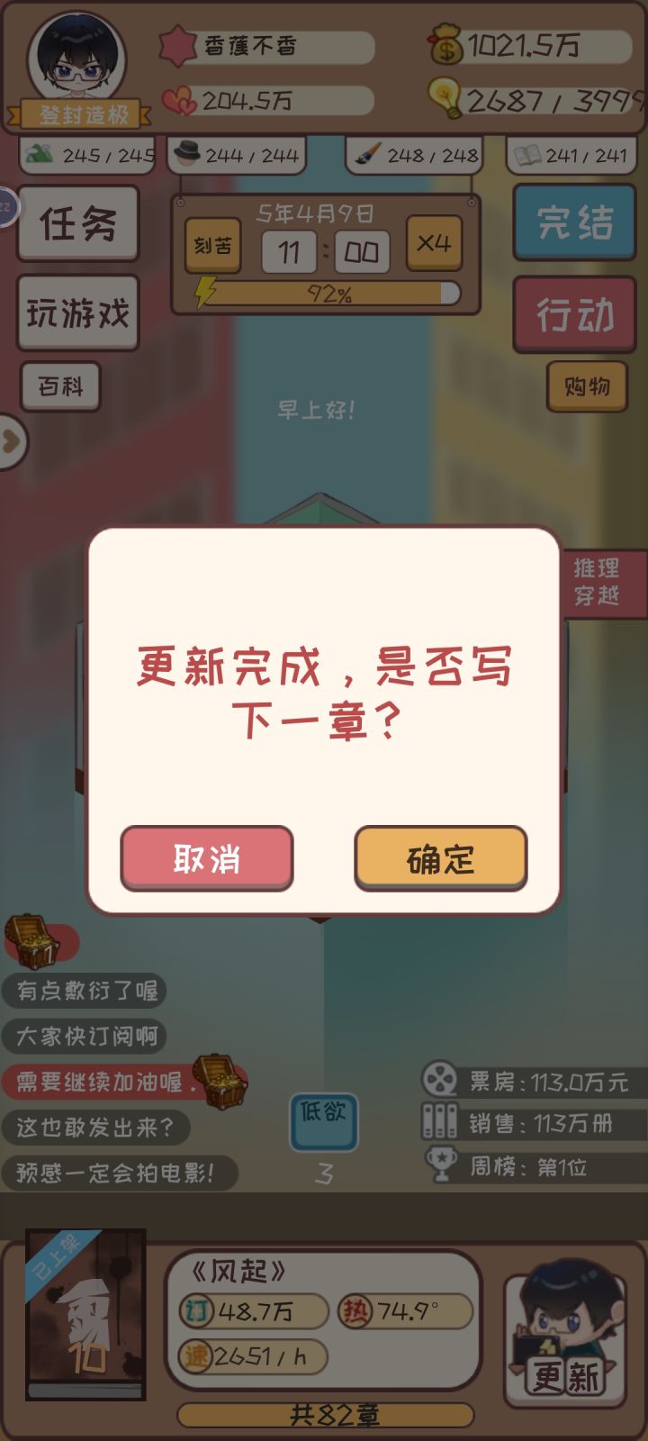 我也算是一名玩的比较久的玩家了,所以我就分享一下我的玩法吧,先附上一张我的游戏时长图接下进入正题,我的玩法是开局不要使用金币,留着就用来付房租。先用玩手机积累灵感积累到999(过程有点艰辛,开四倍时间速度好点),搭配很好的题材开书,评分一般能达到7.0至8.0。所以开局推荐使用肝帝策略提高写作速度,投入灵感为积极。新版本可以用加减号,加到积极就可以了,然后评分提高的同时就可以签约、上架、出版。这