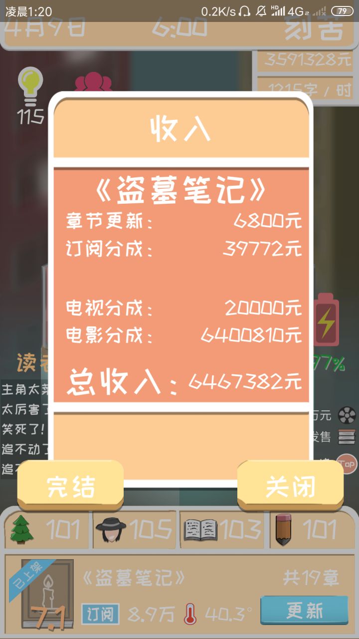 第三次玩,突然发现好简单,这游戏规律是2张签约,10张上架,15张出版,21张电视版权,22张电影版权,30张发售一次,40张发售一次,50张发售一次,当然前提是你的评分要够,订阅上限穿越是1w左右,18k2w左右,合练没去过不知道,终点是11w左右,属性上限200-210,打字上限是2500-2510 ,钱的来源主要是出版跟版权,前两本尽量在20张完结(要是可以就把电视剧版权拿了,电影版权看情况