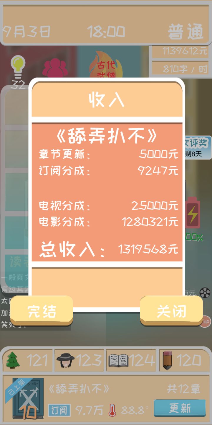 这游戏没更新之前1000元写书挺难的。更新后3000元写书就很简单了。赚钱就靠电影院。一年就把房子升到最高了。具体攻略来了,大家拿笔记一下。开始的时候先随便写一部作品。题材什么的都无所谓。不要开稿。然后疯了玩手机,不要花钱去弄灵感,就玩手机把灵感刷到500-700(玩手机灵感是得5-11)差不多一个月左右就行了灵感够了就可以开书了,开始选的题材不是很火就放弃,重新选火的题材,写第一本书把