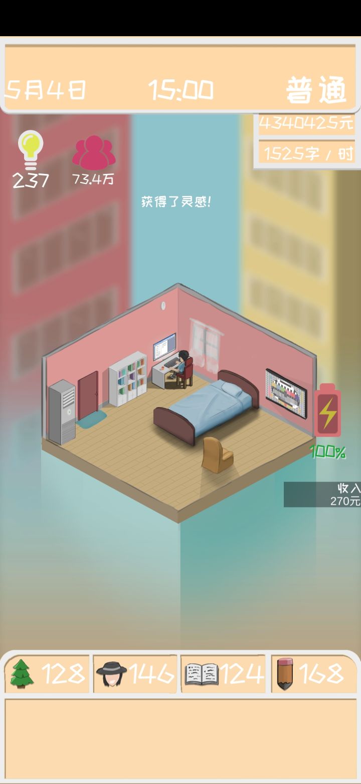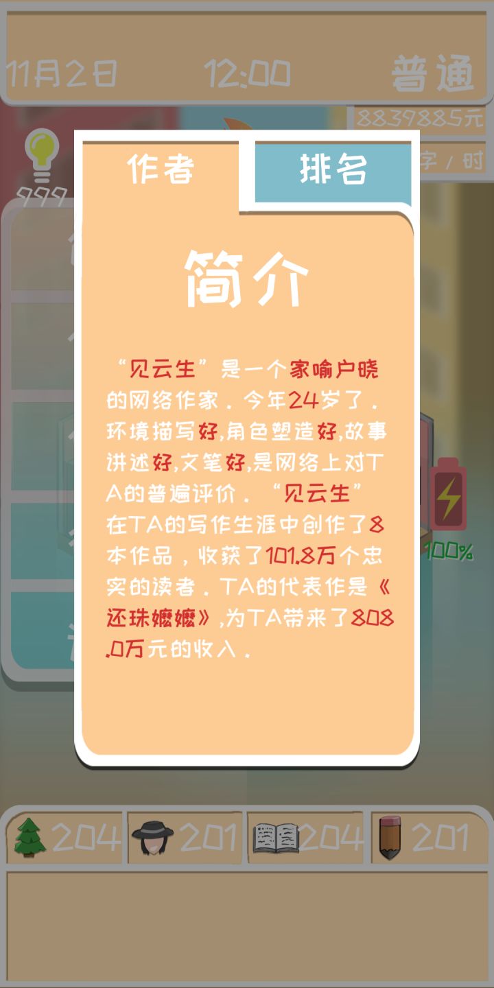 这个游戏的前期是最难度过的,因为体力回复慢,没有经济来源,作品没人看,评分越来越低等等各种问题,以至于陷入死循环。但是只要开始盈利(赚到稿费)就能立刻解决大部分问题。游戏流程快的话不到2h应该就能结束(指排行榜排名)主要消耗时间的是升级技能(我游戏中技能应该是全满了,数值就是图上的相近整数)。一开始游戏有3000元的金币可以用,建议优先升一级床(不过要先去赚200的稿费,不然会破产),游戏还
