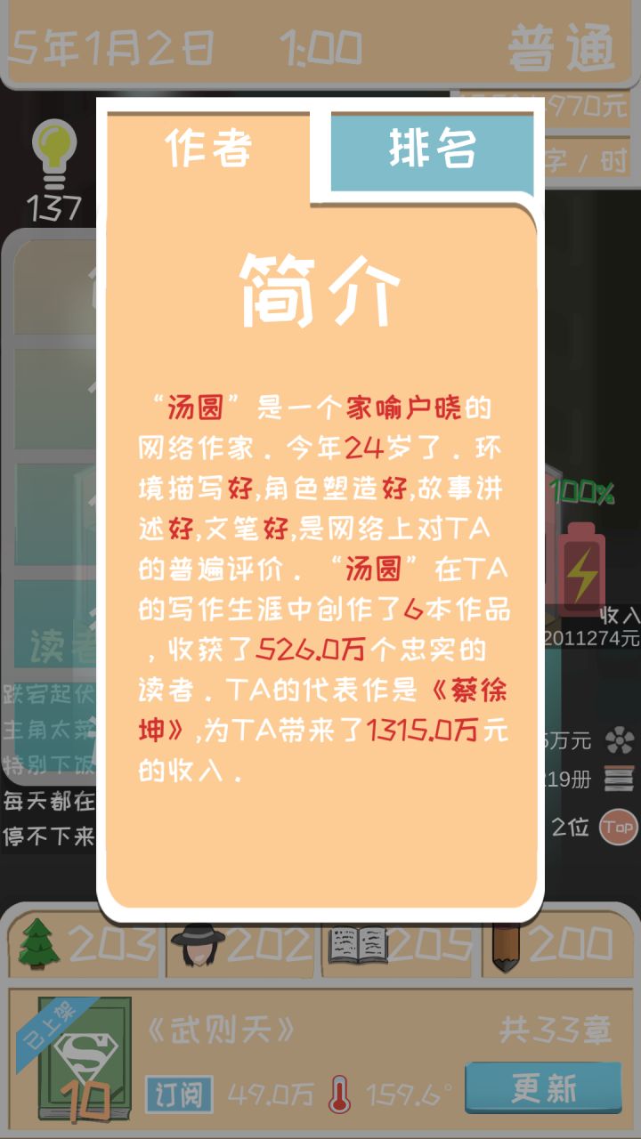 最下面的四项升级最多也就200左右,灵感999,字时2500左右。房子最多升2次,家具每次房子升级也就跟着可以升2次左右。场景50w订阅可以开到演唱会,之后应该还有,但是玩到后面会很无聊,所以就不玩下去了。攻略:一开始在行动那里先玩手机和公园多筹备灵感,最好有200多左右,不用投稿去打工,因为钱够用,但也不要用太多,作者好像只会资助你俩次,然后写第一本书,开第一本书最好等到下个月的第一天,因为