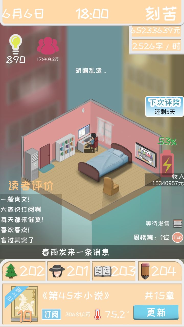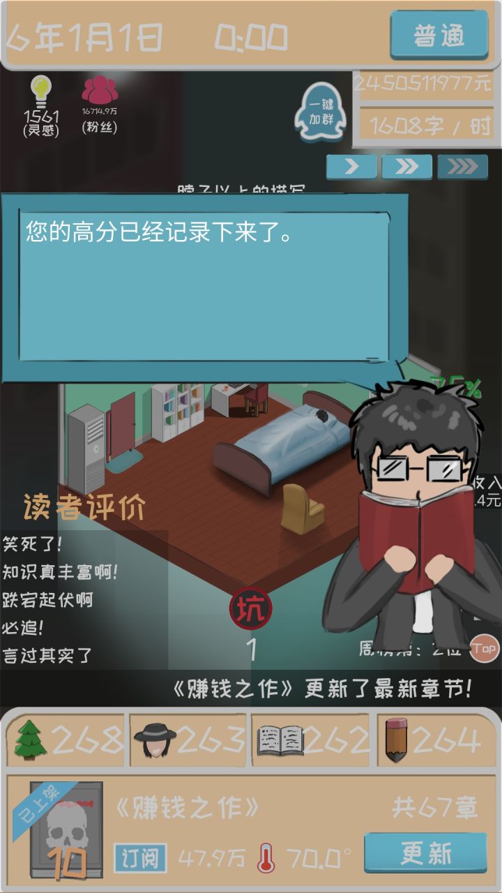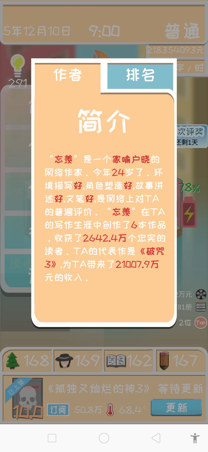(结尾附带有教学和新手前期的一种思路)15亿粉丝,3亿订阅,每更新一章就是1500万到手,枯燥。书籍出版,立即大卖实体书上架5000万销量,7000万入手然后是重头戏,电影上映首日票房20亿!打破世界纪录啊。然而,惊喜过后助手告诉我破产了,并告诉我,这是最后一次补助,随后他还祝贺了我的票房?然而,我已经有了不好的预感果然,第二天票房出来过后。。。原来太有钱也是一种错误。枯燥的玩