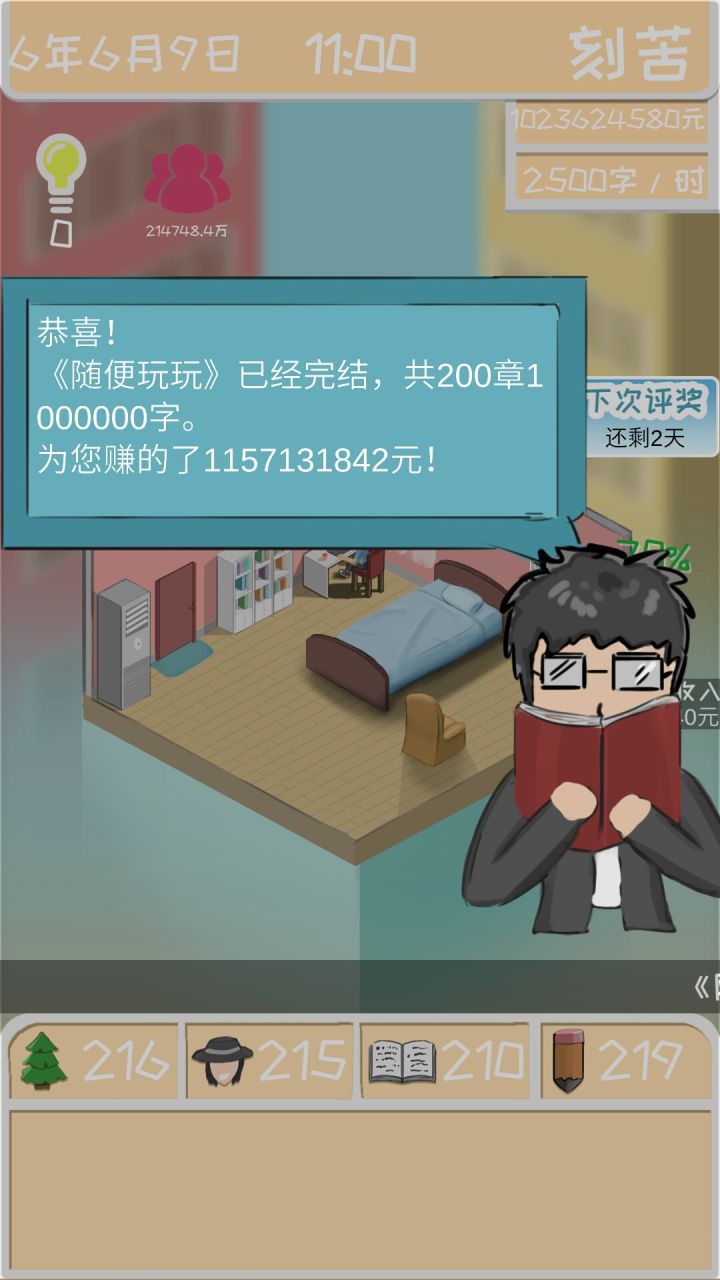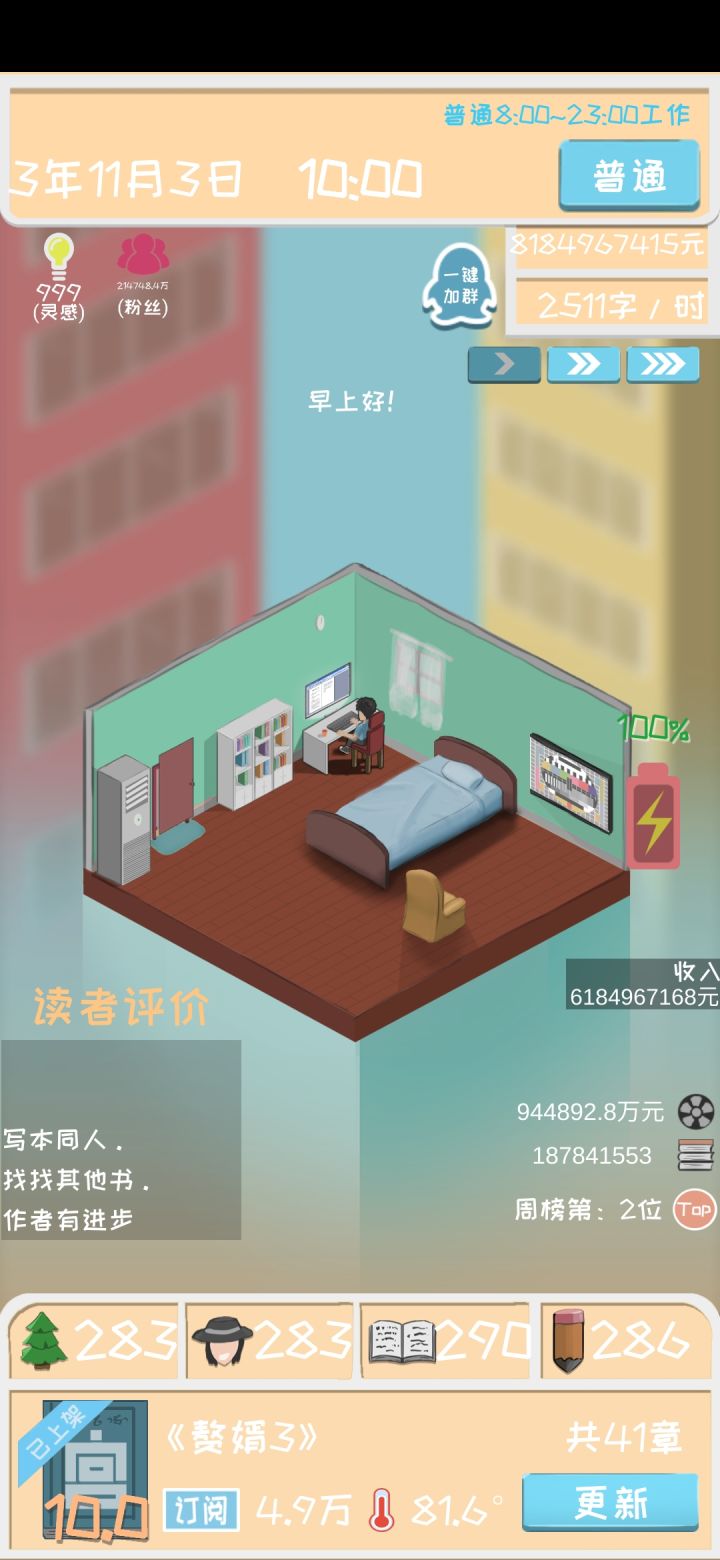 这个攻略现在只看第一段儿的思路就行了,以后的就没用了。因为2.1版本更新以后完全不一样。一个简单的开局方式(其实核心很简单就是前期不写书攒4围属性这样第一本书一开书评分就会超过9.0,不要生搬硬套,我就是下面这个4围开的书)!!!好多小伙伴说在4.10交完房租就破产了,亲们看着时间不够再咱点钱就行啦,没有必要强行交训练的,灵活一点啦。!!!这个玩法最核心的就是前期攒属性,这样第一本书高评分就
