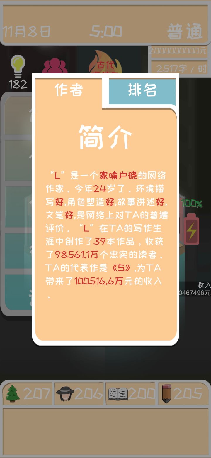 首先这个游戏不难,但也不简单,靠的就是要有耐心和爱因斯坦一样的头脑思维。(最后给个骚气彩蛋😏)好的发展要从一个简单的开局走起(核心很简单就是开局起号四维最好是在平均16左右,前期不写书,用身上的钱堆4围属性,之后第一本书开书评分就会超过8.0)前期屯钱方式①用起号的3000元去堆,四维由低到高,然后剩下的九天时间去攒灵感。到了第二个月会破产,系统会送你1000再去堆另一个思维,然后再接下来第