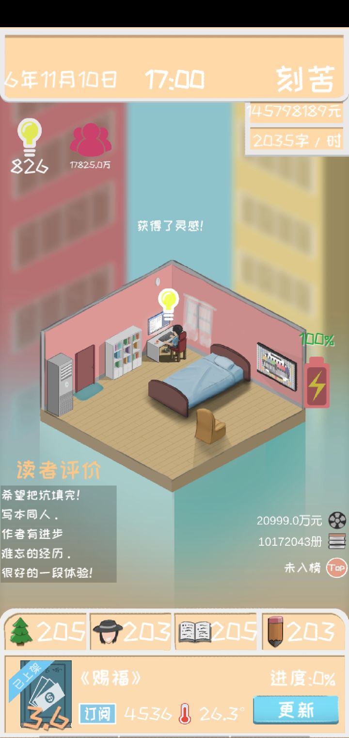刚开始玩时,先用基础的3000快升级四维,由低到高,先不要搞打字速度,这个时候你就破产了,但是有一千块的补助,可以维持三个月的房租,开书时第一本书在穿越网,粉丝到了差不多3w可以去18k,搭配一定要好,比如古代宫颜,投灵感的时候一直投入大量灵感,(没有灵感的时候可以去行动里面读书,免费的那个)不要怕有坑,也不要去填坑,填坑会掉评分,第一本书差不多写到第三章的时候会找你签约,写到第10章时会找你上架