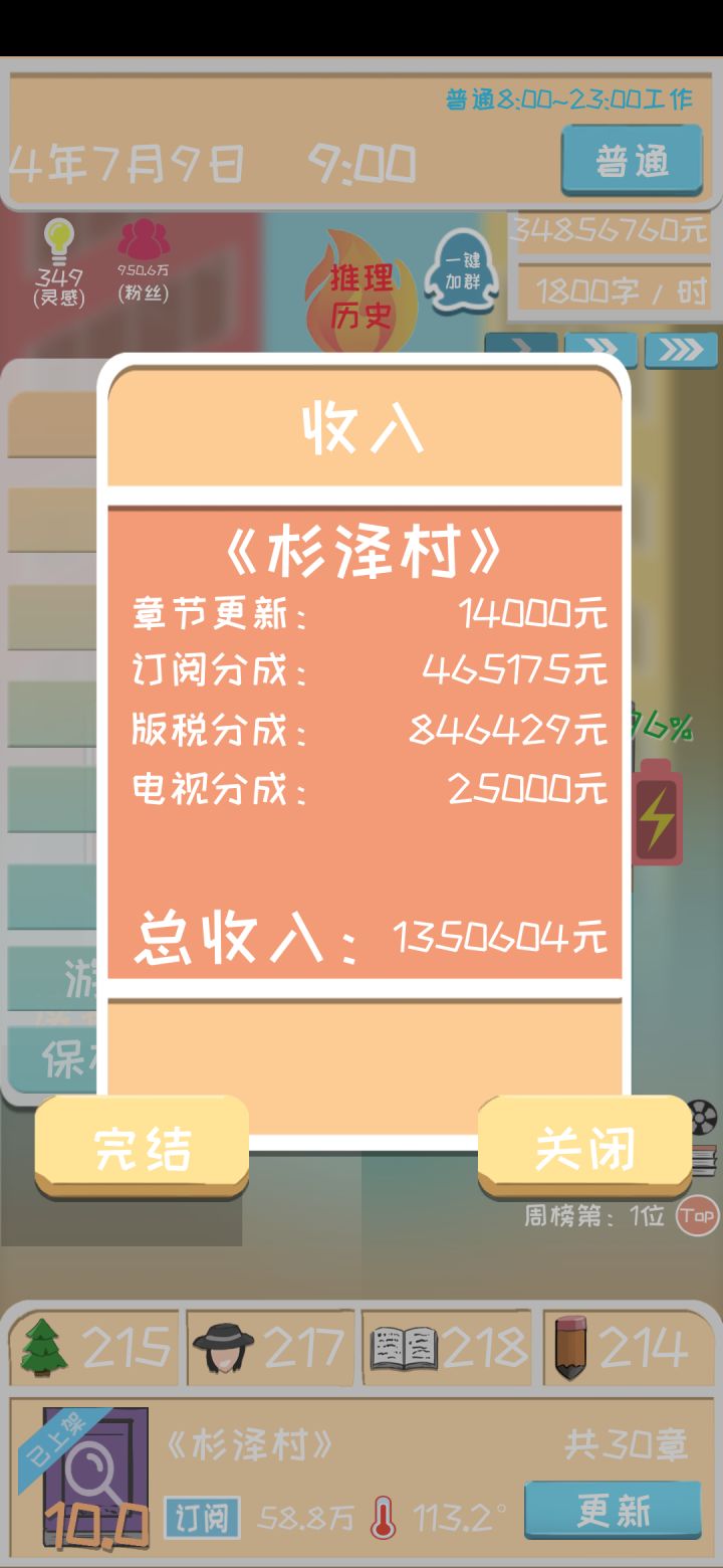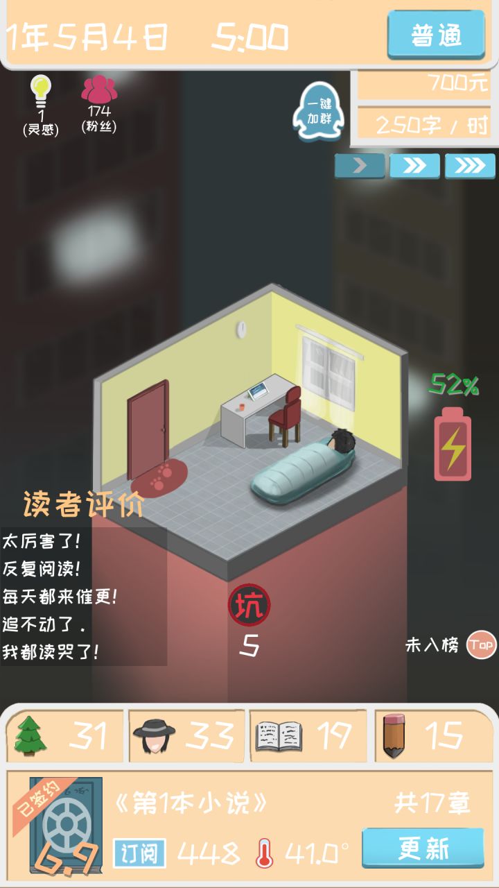 一,游戏周期太长了,不完满五年不给总评分二,游戏灵感获取太太太慢了,写到后期完全写不下去,书柜是什么玩意啊,根本没存在感。三,升级房子有何用???emmmmm,不喜欢评分,毕竟研发人员也很辛苦,我就在这嗷嗷叫就好